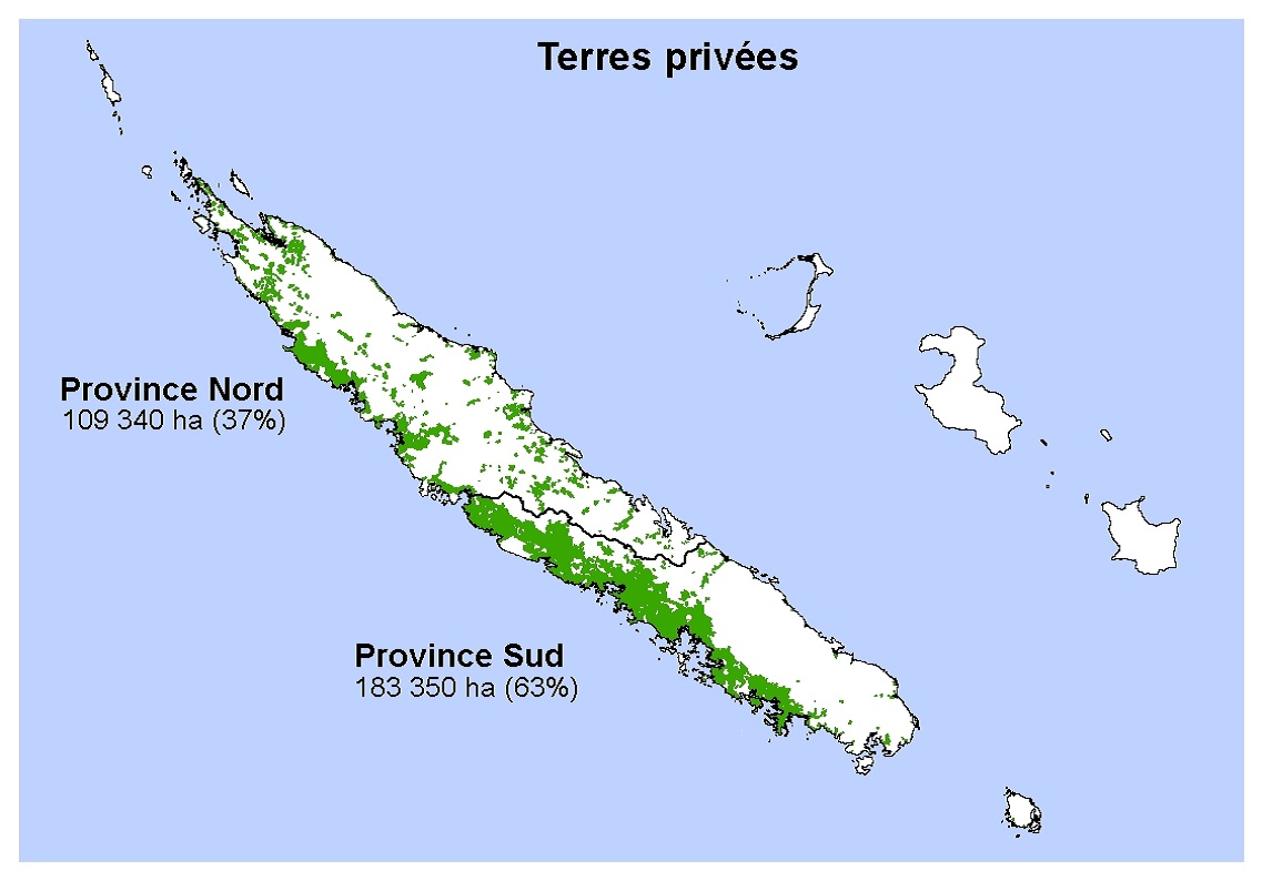 Les terrains détenus par des personnes ou sociétés de statut privé couvrent 289.050 hectares et représentent 16% du territoire de la Nouvelle-Calédonie.